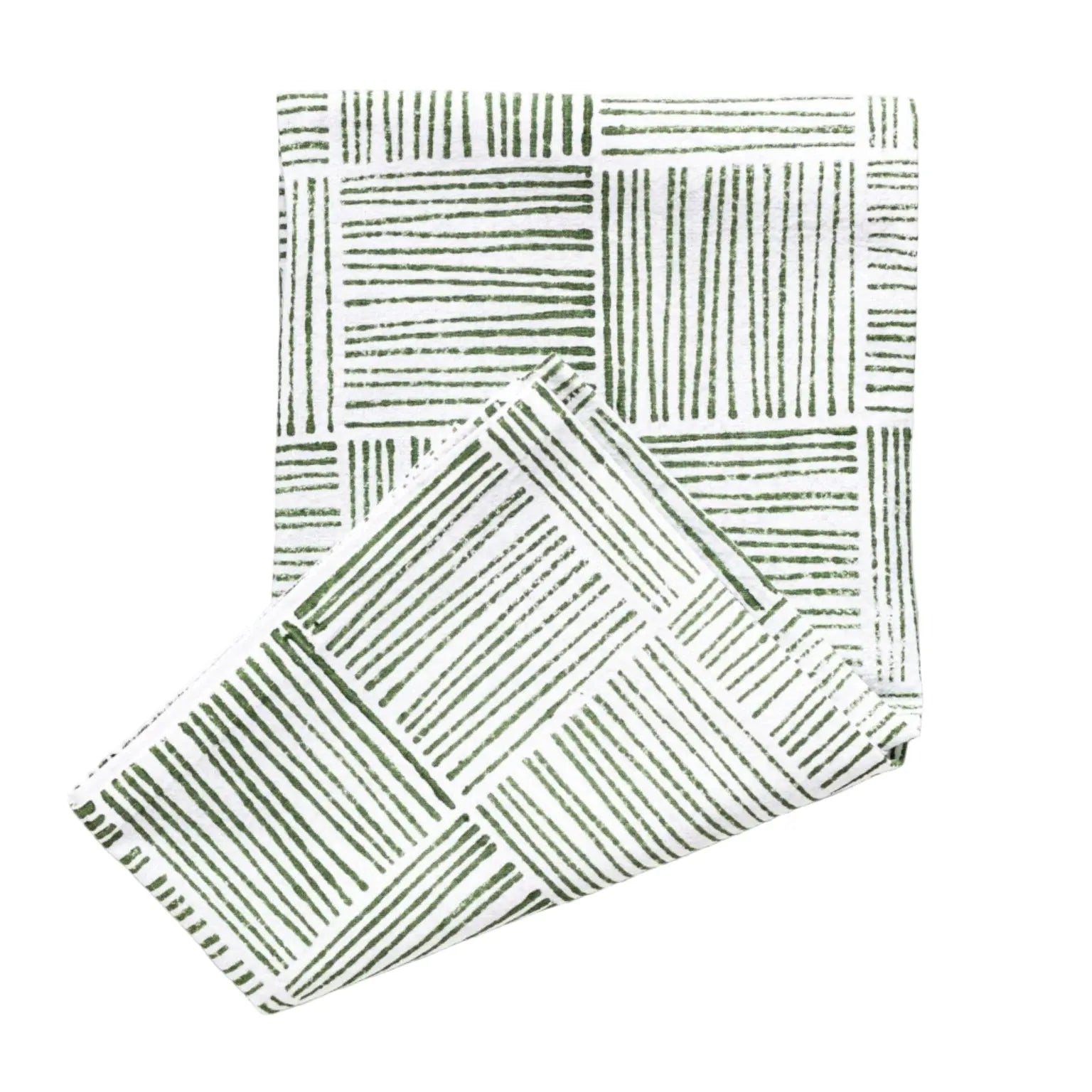 Nothing brightens up a kitchen or guest bathroom more than Mended's Striped Sage Tea Towel. Each tea towel is 100% floursack cotton and hand block printed to be a stunning decor item or a work horse to help you clean! Mix and match with any of our other Mended tea towel patterns to create your very own kitchen or bathroom style or create the most stunning gift for family and friends. Sold individually as a27" x 27" tea towel.