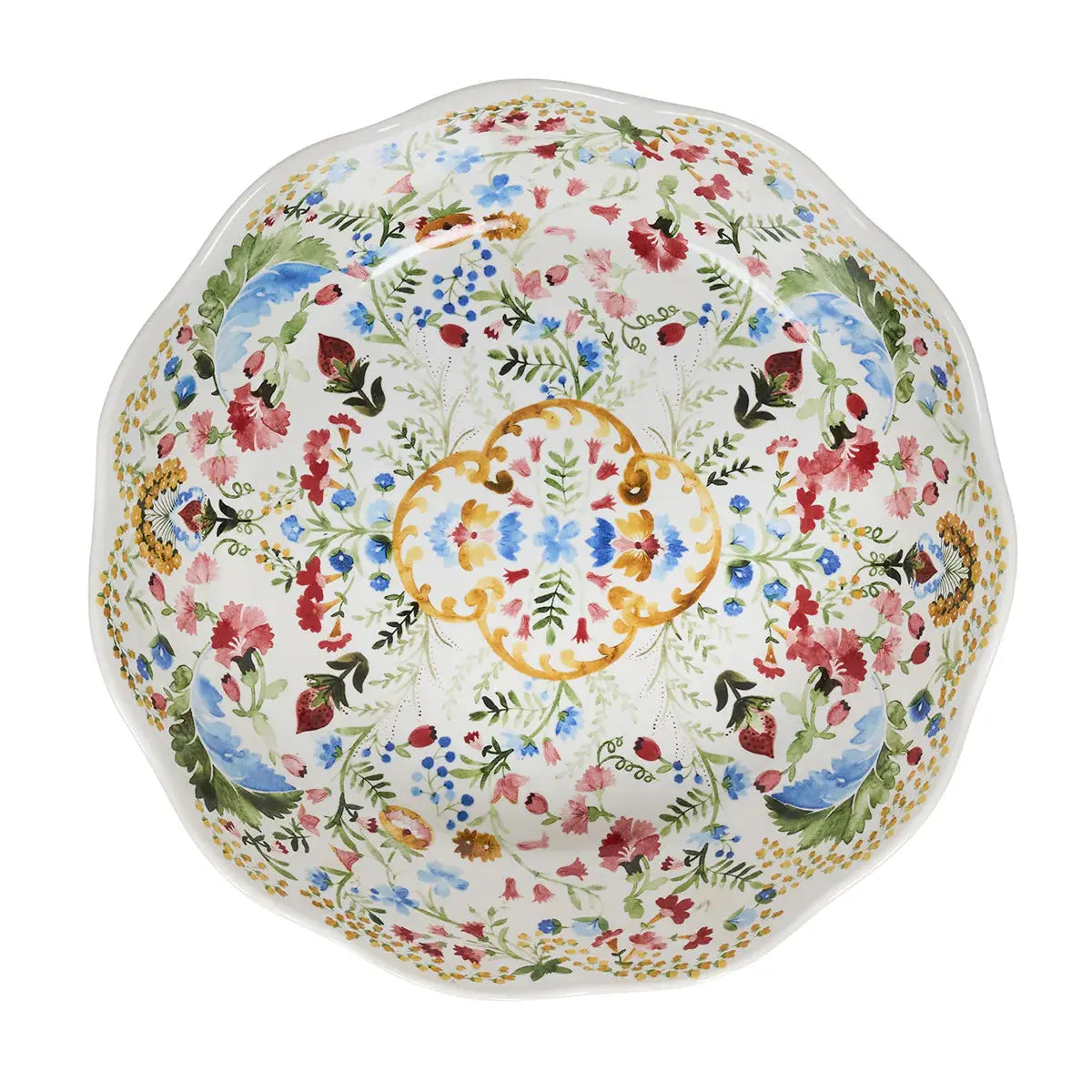 With its ruffled rim and intricate floral motif, this artful and whimsical bowl makes a beautiful statement on the table or buffet, whether it is serving up tender spring salads, fresh pasta primavera, or vibrant summer side dishes of farmer’s market fare.